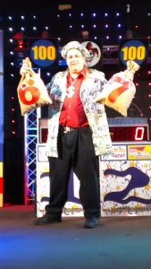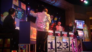 Our Great Gigantic Game Show Give Away promotion is a set of mostly risk reward (games of chance) that show big.  They can be grouped together as a large show that lasts about 90 minutes and involves up to 60 people who are eliminated down to one big winner – or they can be used as a traffic builder for casino floor promotions or trade shows. With an inventory of over thirty large and video based games,  Game Show Giveaway is great for casinos, event marketing, malls, theatres, cruise ships, fundraisers, festival grand stands, college concerts, and more.